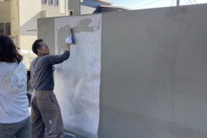 エクステリア(屋外)の塀は、常に雨や湿気にさらされます。エアーウォールのベースコートは透湿性を持ち、内部に浸入した水分を外部に放出する機能があります。これにより、水分による膨れや剥離を防ぎます。